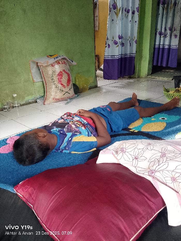 A young boy is sleeping on a blue mat with a cartoon design. He wears a blue t-shirt and shorts. A large red pillow sits near his head. Behind him, a sack of rice leans against a green wall. Curtains with a tulip pattern hang in the background. A basket of bananas rests on the tiled floor near his feet. Bottles are visible in the distance near the sack of rice. A watermark is at the bottom-left of the image.