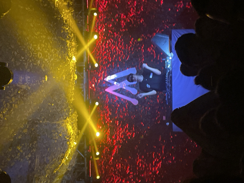 Overhead shot of a DJ performing on stage at a crowded event. Red confetti covers the floor around a brightly lit "W" symbol. The DJ stands behind a mixer under blue lights. Stage lighting creates a yellow glow on the left and vertical beams with spotlights. The right side is obscured by a dark foreground, likely an audience member's head.