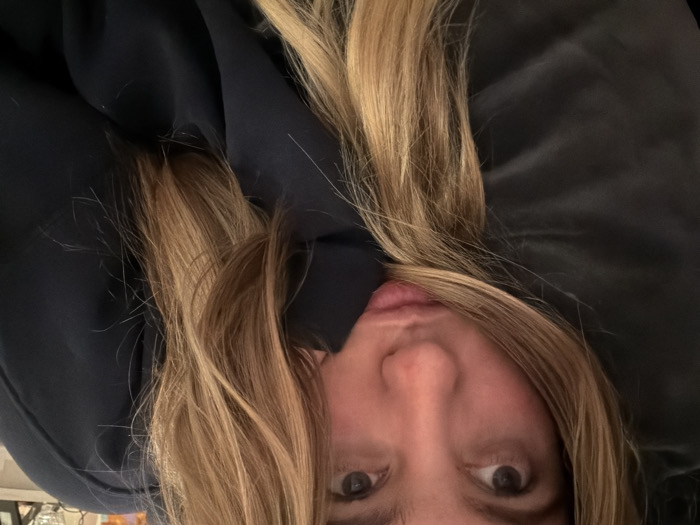 A woman with long, blonde hair and fair skin is looking directly at the camera with a relaxed expression. The image is rotated, with her head tilted to the left. She appears to be wearing a dark-colored hoodie or sweater. Her eyes are wide and brown. The background consists of dark, textured fabric, possibly a pillow or blanket. The lighting is soft and diffused.