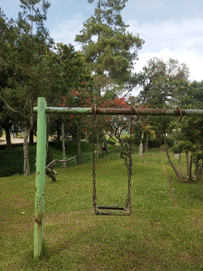 An old, rusty swing set stands in a grassy park. The swing's chains are heavily corroded, and the seat shows signs of wear. The supporting bar is also rusted, while one pole is painted green and showing signs of chipping. Trees and shrubs surround the swing set, with some trees bearing red flowers. The sky is partly cloudy.