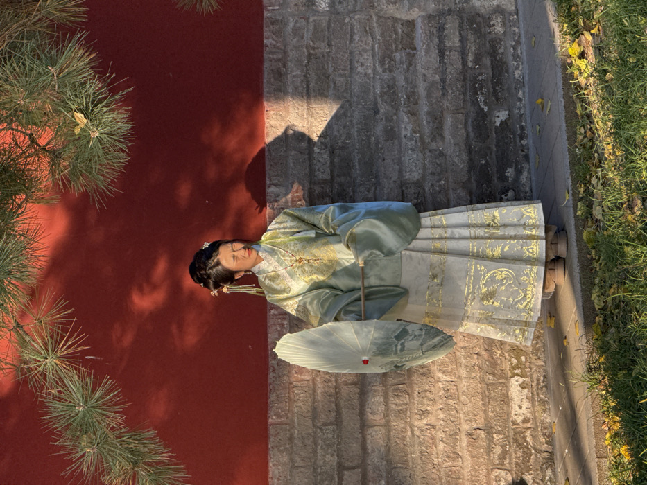 A woman in traditional Chinese clothing stands on a brick path. She holds a closed parasol. Her outfit is primarily pale green with gold accents. To the left, a red wall is partially shaded by pine branches. The brick path is bordered by grass and scattered yellow leaves on the right. Sunlight casts a shadow next to the wall.