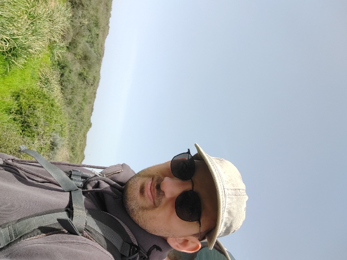 A male individual is depicted in a selfie-style outdoor photograph within the Hof HaCarmel Regional Council, Israel. The subject, positioned on the right side of the frame, wears a light-colored baseball cap and dark, round-framed sunglasses. He has visible facial stubble and is wearing a dark grey hooded sweatshirt with a grey backpack, the straps of which are visible across his chest. He faces the camera directly, exhibiting a slight smile. The background consists of an ascending natural terrain covered with varied green vegetation, including lighter green grasses and darker green shrubs. The sky, occupying the upper left and central top portions of the image, is clear and pale blue, suggesting daytime conditions. No other individuals or man-made structures are prominently visible.