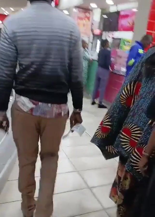 person walking through a shopping mall. The person is wearing a grey and black striped sweater, brown pants, and black shoes. They are carrying a phone in their hand. The camera follows the person from behind as they walk past various shops and food vendors. Other people are visible in the mall, some walking and others seated at tables. There are signs for "Creamy Inn" and "Pizza Inn" visible in the background. The mall has a tiled floor and bright overhead lighting.