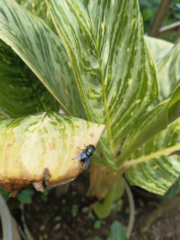 A metallic blue-green fly with a red head rests on a yellowing leaf. The leaf has brown edges and is part of a plant with striped green and yellow foliage. The plant is potted, with glimpses of soil and other green leaves visible beneath the main leaves. The image is a close-up shot.