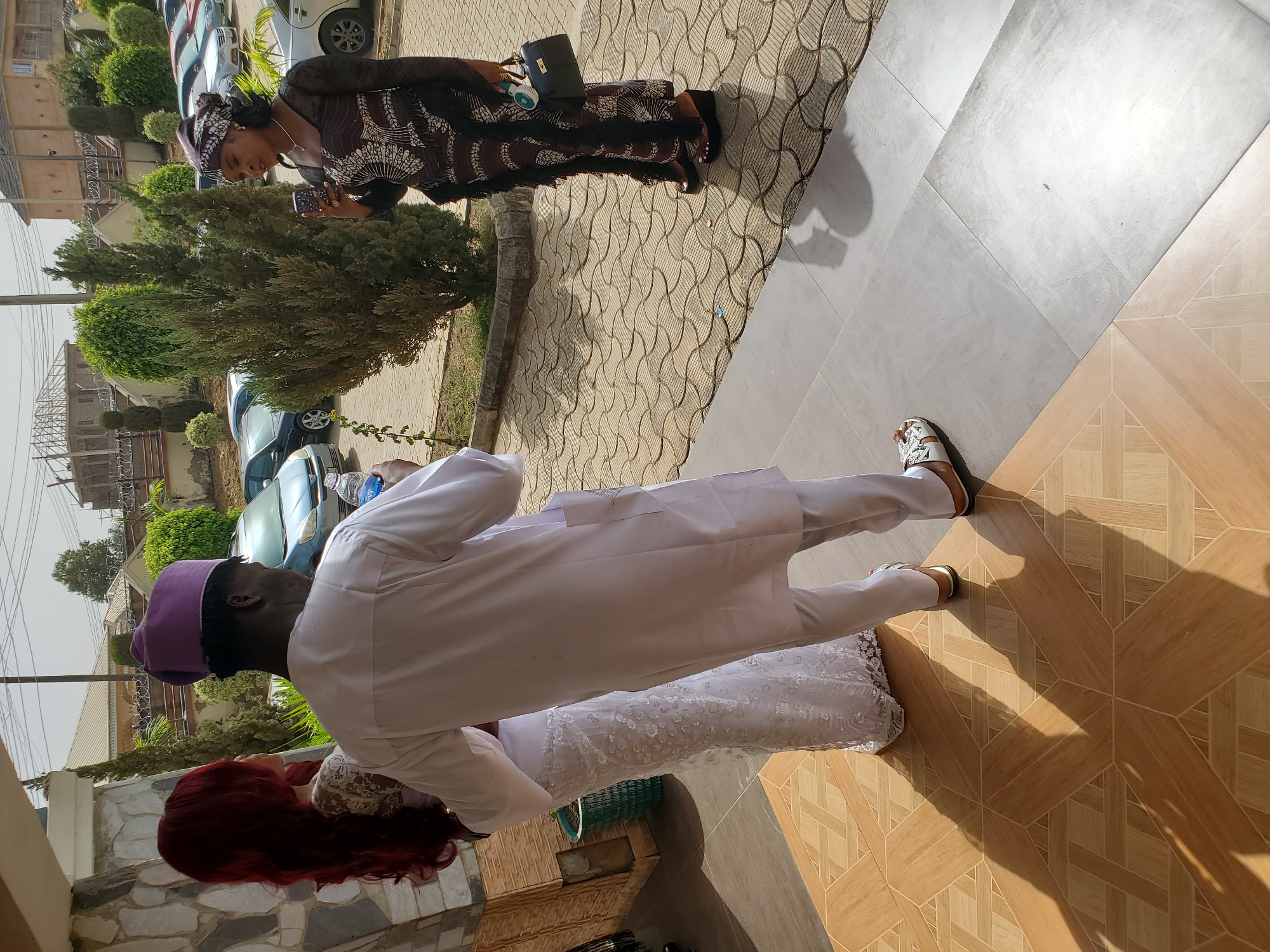 The image portrays an outdoor scene in Jos, Nigeria, featuring three individuals positioned on a paved surface next to a building. The foreground shows light-colored tiled flooring with a section of light brown geometric pattern. Beyond this, the ground transitions to interlocking circular pattern paving. On the left, partially visible, is a female with long, wavy red hair, wearing a white, floor-length lace gown. She stands facing right, away from the camera. In the center, with his back to the camera, is a male wearing a white traditional tunic and trousers, paired with a purple cap. He holds a transparent plastic water bottle in his right hand, facing towards the right side of the frame. On the right, a female stands facing left, observing the other two individuals or the area. She wears a dark brown and white patterned traditional dress with ruffled accents, a matching dark headwrap, and dark wedge sandals. She holds a smartphone with a patterned case in her left hand, appearing to be using it. Her right hand clutches a black handbag, from which a small white handheld fan protrudes. She wears a necklace. The background displays a parking area containing multiple parked vehicles of various colors, including blue, silver, red, and black. Green ornamental shrubs and trees are distributed throughout the paved environment. Distant buildings feature light-colored walls, security fencing, and corrugated roofs. The scene is illuminated by strong sunlight, casting distinct shadows on the ground, and overhead power lines are visible against the sky.