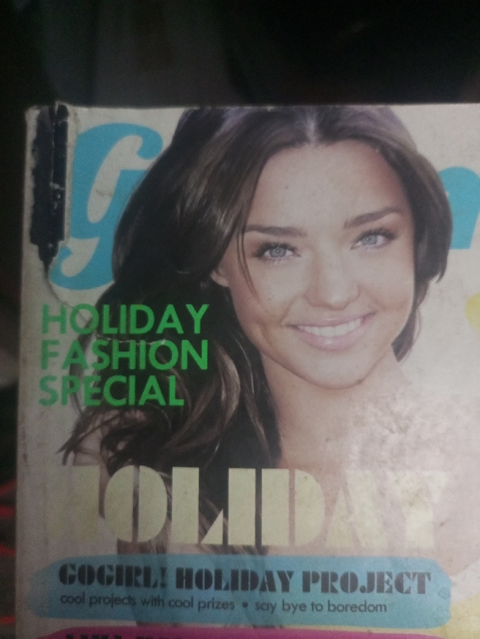The image displays a close-up, slightly angled view of the cover of a "GIRL" magazine. The cover features a smiling, fair-skinned woman, identifiable as model Miranda Kerr, with dark brown hair, blue eyes, and visible freckles. She is depicted from the shoulders up. To the left of her, text in green reads "HOLIDAY FASHION SPECIAL" and a larger, partially obscured word "HOLIDAY" in light yellow. A blue banner at the bottom contains "GOGIRL! HOLIDAY PROJECT" along with smaller text, "cool projects with cool prizes" and "say bye to boredom." The magazine's top left spine shows minor wear. This scene is located in Zee Pin Kone, Myanmar.