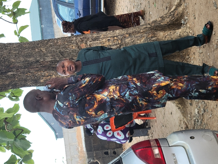 This image depicts an outdoor scene in Suleja, Nigeria, observed under daylight conditions. The foreground features a tall, dark-skinned male positioned with his back partially towards the camera, wearing a long-sleeved tunic patterned with dark blue, orange, brown, and black abstract designs. His right hand is raised to his face, holding a small white object. Facing him, leaning against the rough bark of a prominent tree trunk, is a light-skinned male with a shaven head, dressed in a dark green long-sleeved tunic featuring vertical embroidered lines on the chest, matching trousers, and dark green sandals. His mouth is open, indicating speech or a reaction to the other man. To the left, partially obscured by the patterned-tunic man, a female in a purple patterned garment is seated on an orange chair. To the right of the tree, in the background, another female wearing a dark head covering, a dark top, and a patterned brown and black skirt or wrap stands near the rear portion of a blue vehicle. A silver sedan's rear-left section is visible in the extreme foreground on the left. The ground surface is unpaved, appearing dusty or sandy. In the background, several buildings are present, including one with a light blue-green roof and another with a beige wall and a fence. The sky overhead is bright.
