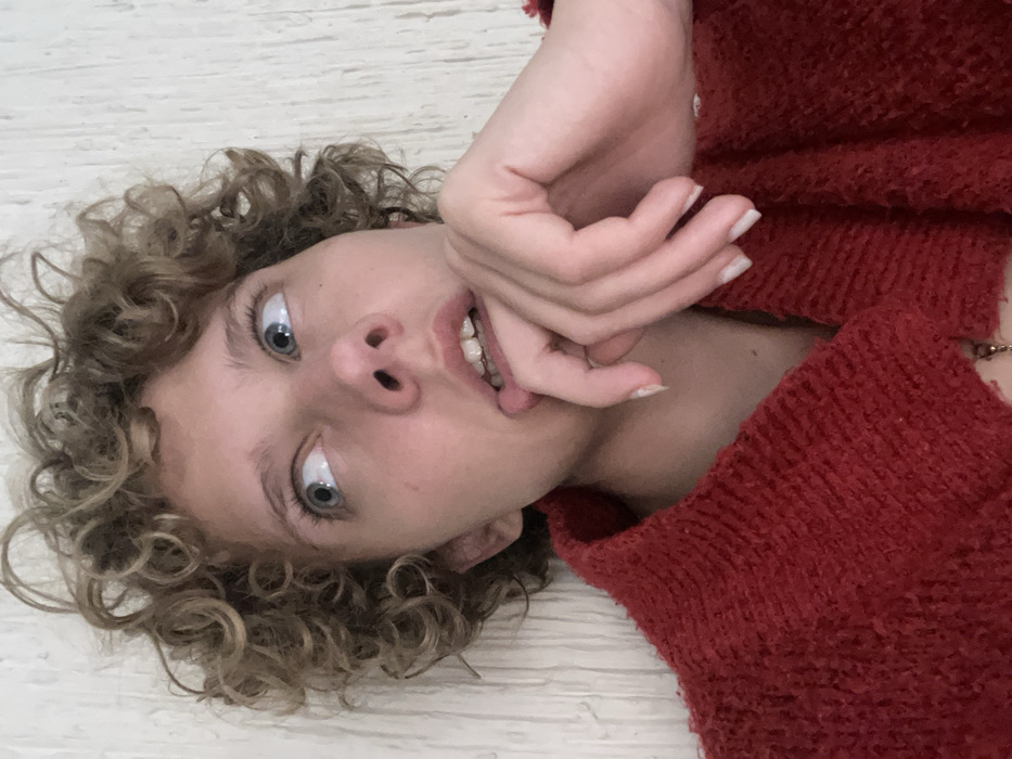 The image presents a chest-up portrait of a single individual, appearing female, with fair skin, light blue eyes, and short, tightly curled, light blonde hair. The subject wears a textured, high-collar red garment, possibly a sweater or cardigan, with a thin metallic chain visible below the neckline. The individual's head is tilted slightly back, with the gaze directed upwards and to the viewer's right. The mouth is partially open, and the right hand is positioned with the thumb resting near the lower lip, while the other fingers are loosely curled against the chin area. The fingernails are painted a light color, possibly white. The background is a light-colored, vertically textured surface, out of focus. The scene is located in Mexico City, Mexico.