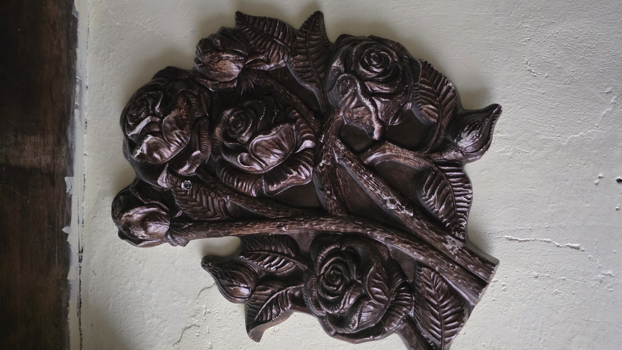 A wood carving of roses and leaves is affixed to a white wall, likely inside a building, in Ledenik, Bulgaria