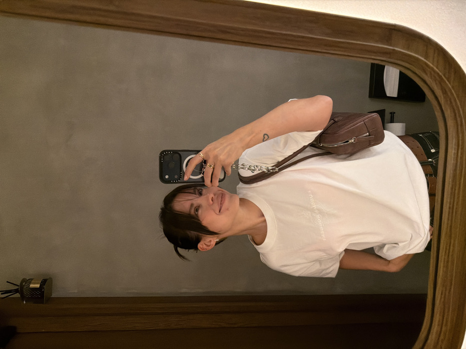 A female individual, appearing to be in her 20s or 30s, with dark hair styled in a messy bun with bangs, is captured in a mirror selfie within an interior space in Moscow, Russia. She is smiling subtly, looking slightly to her right. She holds a dark-colored smartphone, equipped with a visible MagSafe ring, in her right hand. Her right hand displays several gold-toned rings. A small heart tattoo is visible on her left bicep. She wears a white short-sleeved t-shirt with the inverted text "FUSSI ROBERTI" printed on the chest, dark trousers with white stitching, and a brown belt. A dark brown shoulder bag with a silver chain strap hangs from her left shoulder. Her left hand is partially obscured, tucked into her pocket. The background behind her consists of a plain, light grey wall. A dark cylindrical diffuser is mounted on the wall above her head. A white toilet paper dispenser is visible on the wall to the lower right. The mirror itself has a distinctive curved, light wooden frame. The lighting is soft and even. The specific address within Moscow is not discernible, but the environment suggests a modern restroom or dressing room.
