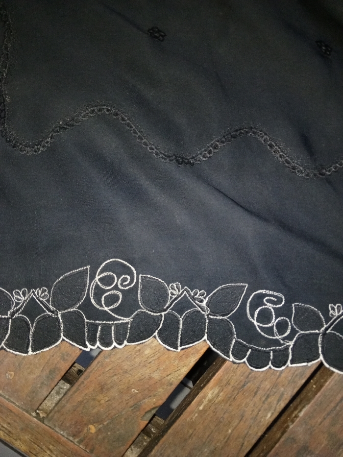 Location: Unknown, Unknown. The scene depicts a close-up, angled view of a black textile surface partially draped over a wooden structure. The upper portion of the textile, a dark, presumably black fabric, exhibits a wavy, scalloped pattern of dark thread embroidery. Below this, the fabric is plain black, showing minor creases and variations in light reflection. The lower edge of the black fabric features a prominent border of white embroidery, consisting of stylized floral or leafy motifs with intricate swirling patterns and solid outlines. This embroidered edge rests on or is draped over a horizontal wooden surface. The wooden surface is composed of parallel planks, dark brown in color, displaying visible grain and minor surface imperfections consistent with aged or utilitarian wood. No individuals, actions, or interactions are visible within the frame. The lighting is subdued, highlighting the contrast between the fabric and the embroidery.