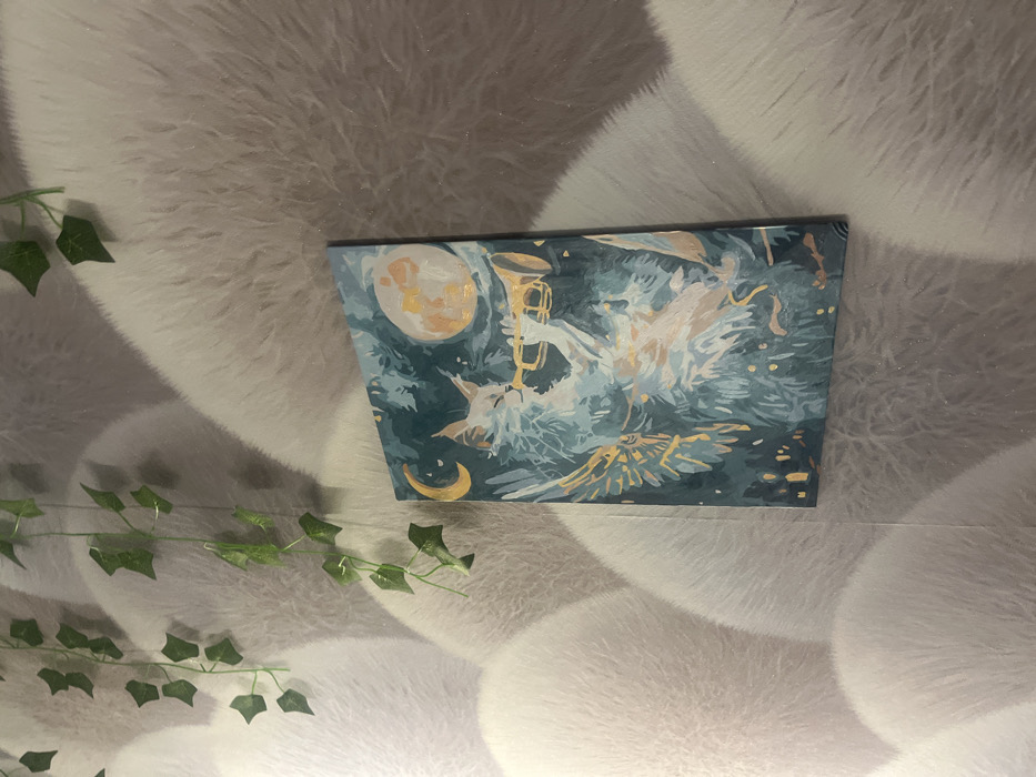 This image depicts an indoor scene, stated to be located in Ново-Никольское, Russia. The background consists of a wall covered in a light grey, textured material resembling soft, layered fur or fluffy wallpaper. A single strand of artificial green ivy with multiple leaves hangs vertically from the upper left portion of the wall. A rectangular canvas painting is prominently displayed on the wall, positioned slightly to the right of the center and angled such that its left edge is closer to the viewer. The painting portrays an anthropomorphic, white, fluffy cat-like creature with closed eyes, depicted playing a golden trumpet. The creature has abstract golden wing-like elements on its left side. The painting's background is dark teal, featuring stylized trees or foliage, a large golden moon in the upper right, and a smaller golden crescent moon in the upper left. The scene is static, illuminated by ambient indoor lighting, and contains no visible human subjects or direct interactions.