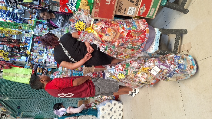 A horizontal eye-level shot depicts an outdoor marketplace. A woman in a black dress and a man in a red shirt stand next to two plastic-wrapped gift baskets, with prices of 80 and 40. A box and a couple of stools sit to the right of them and a stack of toilet paper sits under them. A small child sits on a blanket to the left. A second woman looks down from behind the gift baskets. There are shelves of goods stacked to the left.