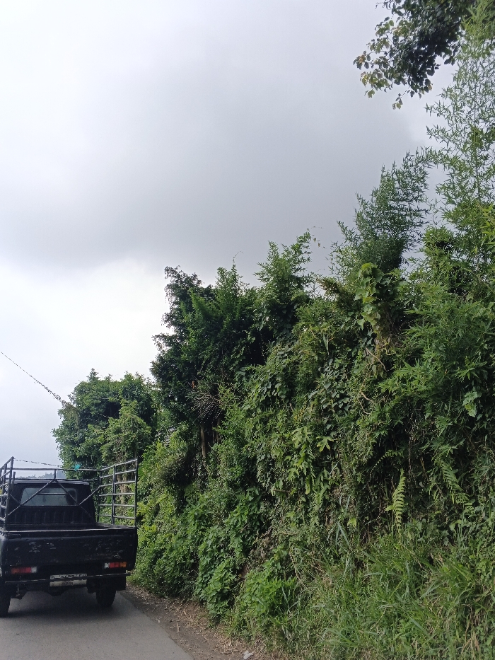 The image displays a roadside scene in Uato Carabar, Timor-Leste, under an overcast sky. A dark-colored pickup truck is positioned on the left side of a paved road, viewed from its rear-left aspect. The truck's bed is equipped with a tall, open-cage metal frame. The road surface is dark gray asphalt. To the right of the road, a dense, green embankment of various plants, including broadleaf foliage, ferns, and bamboo-like stalks, rises steeply. Thin utility wires are visible extending diagonally across the upper-left portion of the frame. No individuals or active interactions are depicted.