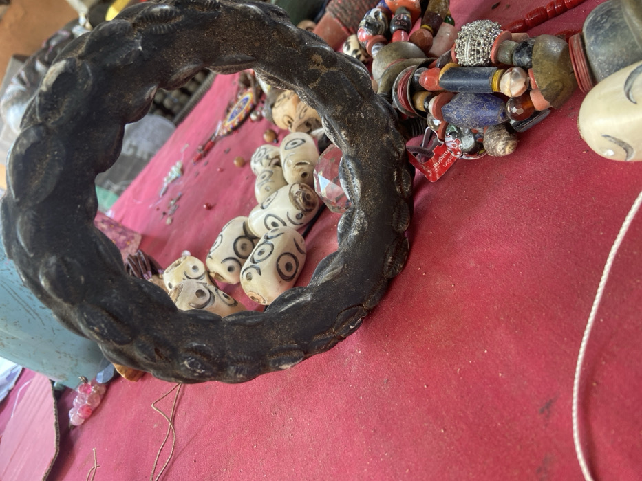 The image depicts a close-up, elevated view of assorted decorative beads and an ornate ring displayed on a vibrant red fabric surface, likely a market stall in the city of Iranla, Nigeria. In the foreground and center, a large, dark brown or black circular object, possibly a bracelet or ring, is prominently featured. It has a textured, sculpted surface with raised, interlocking patterns, resembling a braided or leaf-like motif. Inside and around this ring, numerous cream-colored, ovoid beads are scattered. These beads feature distinct dark circular or spiral patterns, suggesting a hand-drawn or carved design. A faceted, clear or reddish crystal bead is also visible near the lower interior of the dark ring. To the lower right, a cluster of diverse, colorful beads forming part of a necklace or multiple strands is present. This collection includes various shapes (spherical, cylindrical, irregular) and materials, with beads in shades of red, blue (lapis lazuli-like), orange, brown, grey, and silver, some appearing to be wood, stone, or metal. A red tag or label with white text, partially obscured, is attached to this cluster. In the background, on the red surface, additional smaller, individual beads in pink, light blue, and red are scattered. Thin golden strings are also visible on the left side. A blurred, light blue object, possibly a container or another fabric item, is in the upper left background. No individuals are present in the frame, and no specific actions or interactions are depicted. The scene suggests a retail or display setting for handcrafted items.