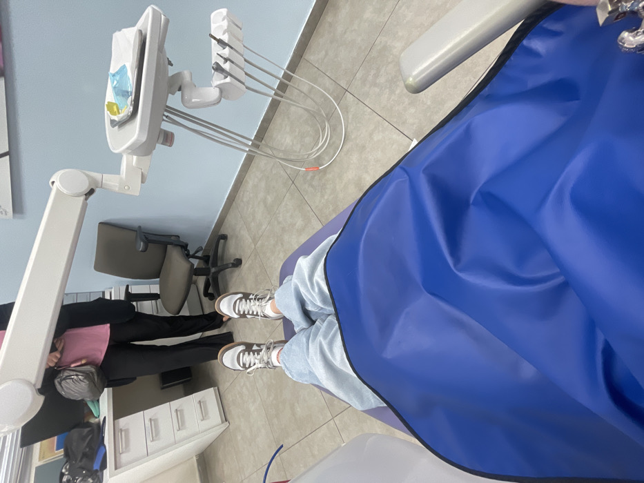 An individual sits in a dentist chair covered with a blue plastic apron. They wear light-wash denim pants and brown-and-white sneakers. A dental assistant stands beside them, dressed in black pants, a pink shirt, and a gray purse. Dental equipment is visible, including a light and various tools with connecting hoses. The room appears to be a typical dental office with tiled floors and white cabinets.
