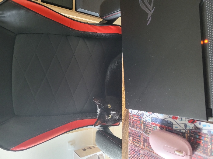 The image captures an indoor scene in Vila Nova de Famalicão, Portugal. A solid black domestic cat with visible yellow-green eyes is situated within a black and red gaming chair, with its head resting just above a wooden desk surface. The chair features black upholstery with a diamond stitch pattern on the backrest and prominent red accents along its side edges. On the desk, a closed black laptop computer is positioned, displaying a metallic "ROG" logo on its lid, which shows several superficial scuff marks. An illuminated orange indicator light is visible on the laptop's front edge. To the immediate left of the laptop, a pink wireless computer mouse rests on a multi-colored mouse pad depicting an abstract or architectural pattern. The background consists of a light-colored wall with a white electrical outlet and a partial view of a light brown wooden furniture unit. No human subjects are present.