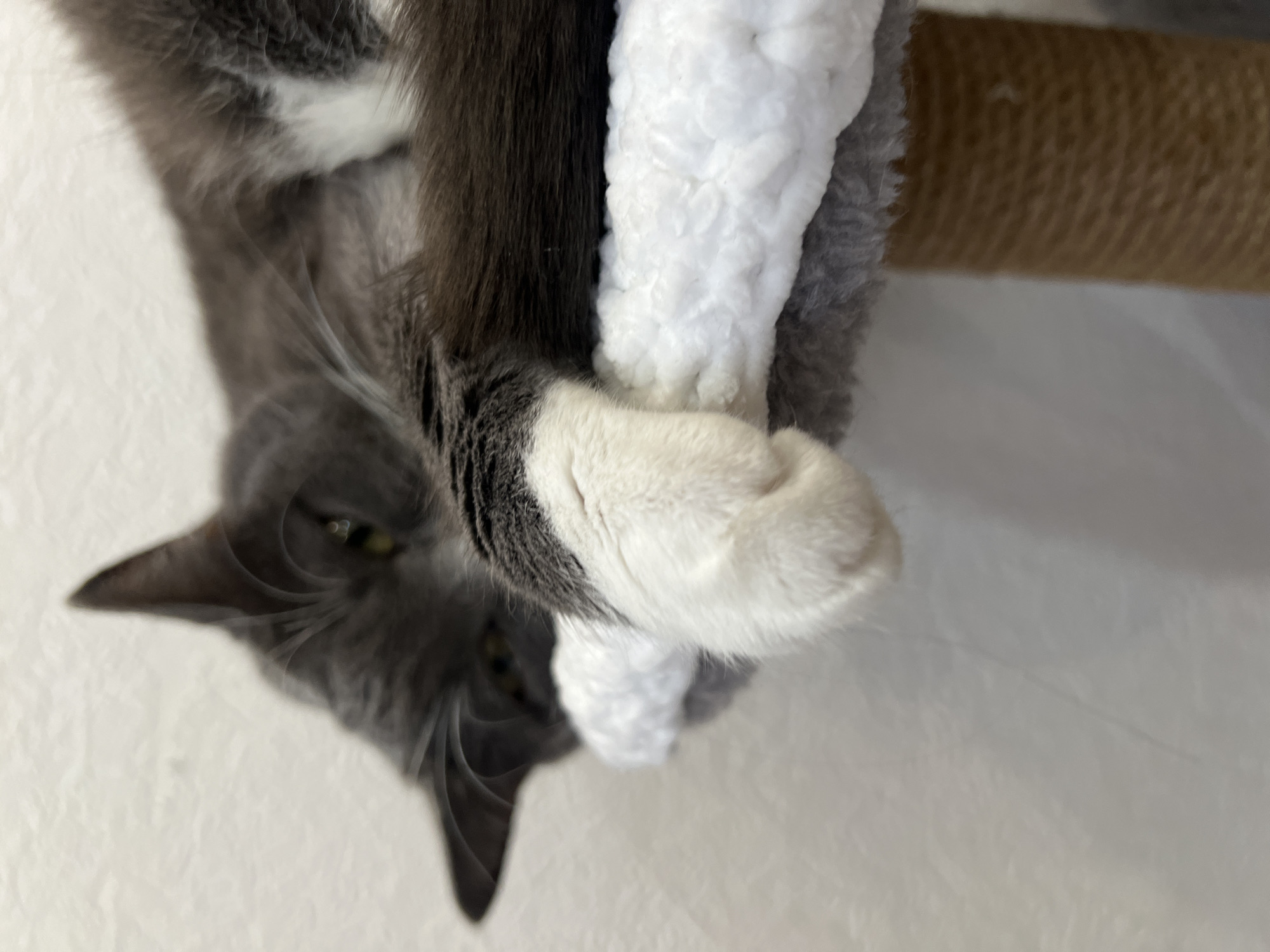 A gray and white cat is shown upside down in a close-up shot. The cat is clutching a white, fluffy object with its white paw. Behind the white object is a brown, rope-covered post, likely part of a cat tree. The background appears to be a plain white wall. The cat's head is angled downwards towards the lower left corner of the frame.