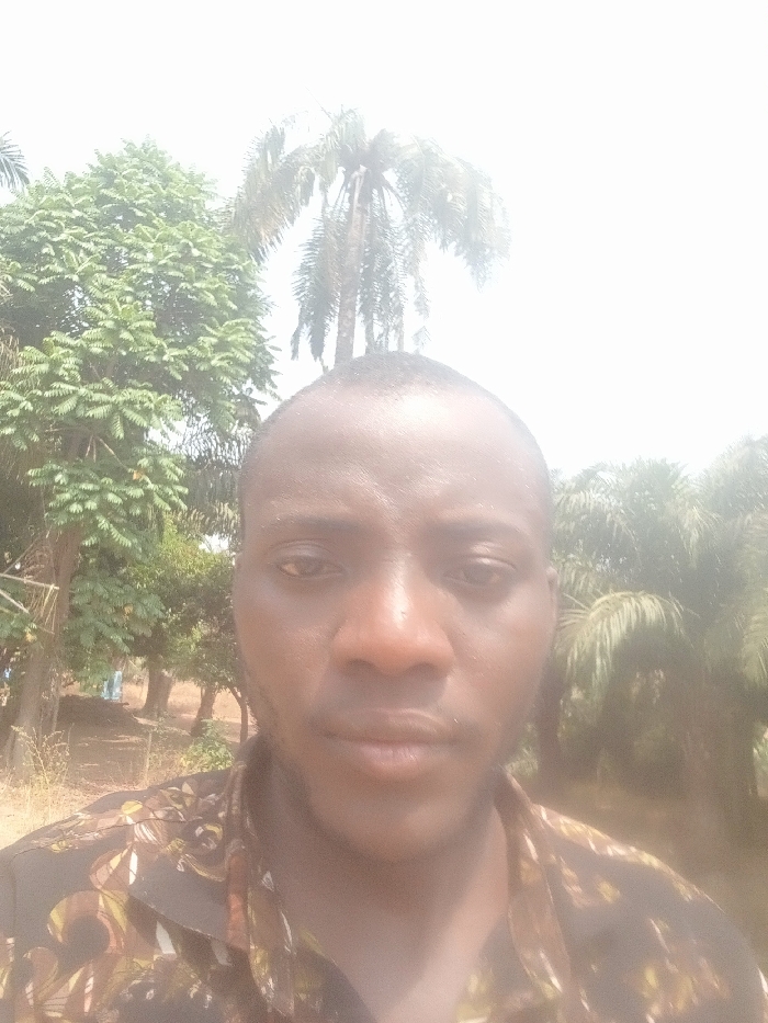 The image displays a close-up, chest-up portrait of an adult male in an outdoor setting within the city of Akwanga, Nigeria