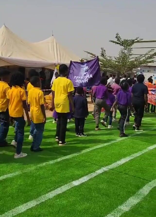 A video shows a group of people, most of whom appear to be children, walking across a green artificial turf field marked with white lines. The group is walking from left to right in the frame. They are wearing various colored shirts, including yellow, purple, orange, and white. Some are also wearing blazers. Several carry banners, including one that says "AMETHYST HOUSE." A large white tent is visible in the background, along with a building with a gray exterior. The sky is overcast. There is music playing in the background.