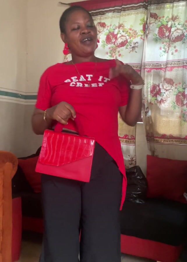 A woman is dancing in a living room. She is wearing a red t-shirt with white lettering, black pants, and red earrings. She's also holding a red purse. She is facing the camera and moving her arms and body to the music. The living room has an orange armchair, a black and red sofa, and a curtain with a floral pattern. The walls are painted in a neutral color.
