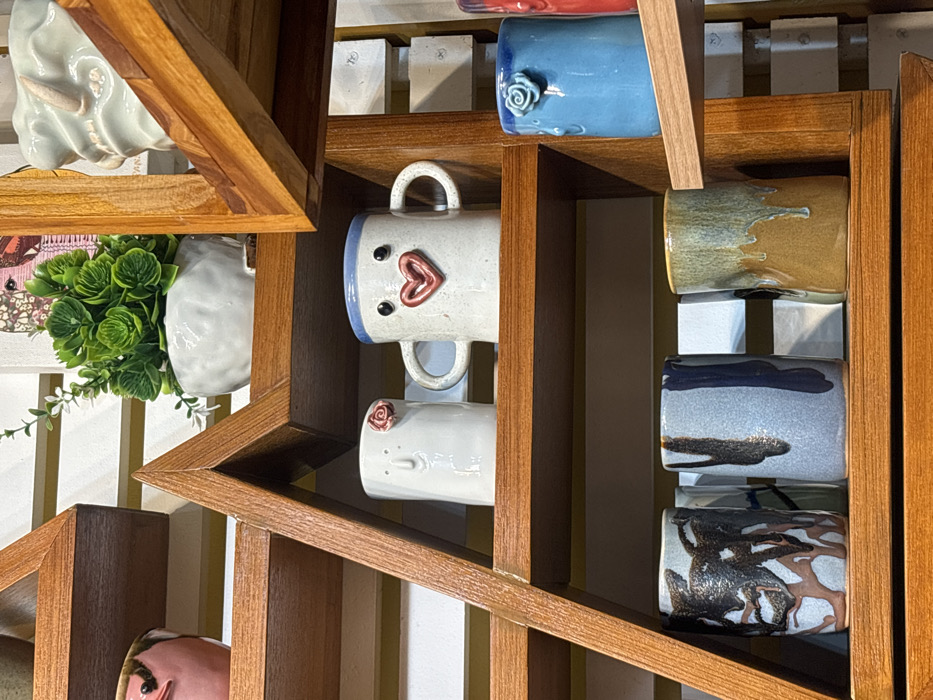 This image depicts a detailed display of handcrafted ceramic items within a retail or market setting in Ban Ao Nang, Thailand. The scene is dominated by a multi-tiered wooden shelving unit, constructed from finished medium-brown wood forming various triangular and rectangular compartments. On the top left shelf, a pink ceramic item with a dark rim and a sculpted feature is partially visible. Centrally, a small green potted plant with dense foliage resides in a textured light gray ceramic pot. To its right, a light blue-gray ceramic object with sculpted features is partially seen. The middle shelf features three distinct ceramic mugs. On the left, a white mug displays a minimalist etched face (two dots for eyes, a faint vertical line, and a small curve for a mouth) with a small red rose embellishment on its right side. Adjacent to it, a light gray mug with a light blue rim features two black dots for eyes and a prominent, glossy red heart shape centered on its front, accompanied by two small handles. To the right, a bright blue mug showcases a small blue rose embellishment on its upper left side. The bottom shelf displays three cylindrical ceramic mugs. The leftmost mug has a light background with an irregular, dripping glaze pattern in dark brown and lighter brown hues. The central mug features a light blue background with a dark blue and black dripping glaze pattern. The rightmost mug has a light brown background with a green-blue and cream dripping glaze pattern. The background behind the wooden shelves consists of a light-colored wall, likely white or off-white, characterized by visible horizontal lines or slats. No people are present, and no actions or direct interactions are occurring. The environment suggests an indoor display focusing on artisanal pottery.