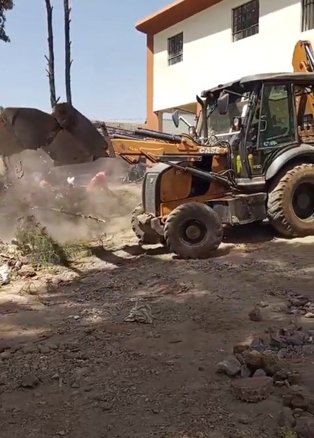 yellow and black CASE backhoe loader digging up a patch of land in front of a two-story building with an orange roof and white walls
