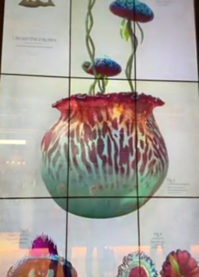 close-up of a large, vertically oriented digital display composed of nine screens. The display presents an illustration of a fantasy plant. The plant features a large, ornate pot-like base in shades of teal and red, with vine-like structures emerging from it, culminating in mushroom-like caps with blue and reddish hues. At the bottom of the display are additional illustrations of similar botanical elements, each labeled with "Fig." and a number. The background of the display appears slightly transparent, revealing blurred figures of people walking behind it. The overall lighting is bright, highlighting the colors and details of the digital artwork. The camera slowly zooms out, showing the full display.