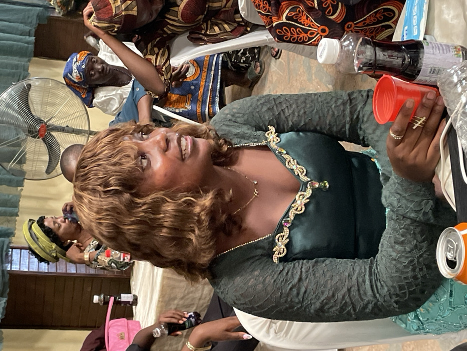 An indoor scene in Barakin Lerawi, Nigeria, shows individuals gathered in a room. In the foreground, a woman with shoulder-length, light brown curly hair and bangs is seated, facing right with her mouth slightly open. She wears a dark green dress with a satin-like bustier and sheer lace sleeves. The bustier features a V-shaped neckline adorned with gold-colored embellishments and multi-colored gemstones, including a prominent green teardrop-shaped gem. A delicate gold-colored necklace is visible. Her left hand, wearing multiple gold-colored rings, including a geometric design, holds a red plastic cup. An orange soda can and a clear plastic bottle containing a dark liquid rest on a surface beside her. In the mid-ground, a woman with a light green headwrap and gold hoop earrings is partially visible, seated at a table covered with a light-colored cloth, and appears to be drinking from a dark object. A pink handbag and another dark liquid bottle are on this table. To the right, another woman is visible, wearing a white blouse, a blue patterned headwrap, and light-colored slippers. Part of an additional person in a patterned garment with orange and brown motifs is also visible. A metal standing fan with dark blades is located against a light-colored wall in the background, beneath a light blue draped fabric. The environment indicates an indoor social gathering with refreshments.