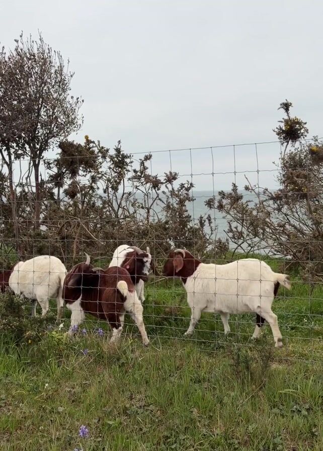 four goats enclosed by a wire fence in a grassy field. Three of the goats are predominantly white with brown heads and legs, while the fourth is mostly brown with white patches. They are standing and interacting near the fence, some appearing to butt heads playfully. Beyond the fence, there are bushes and trees, with a body of water visible in the distance under a cloudy sky.
