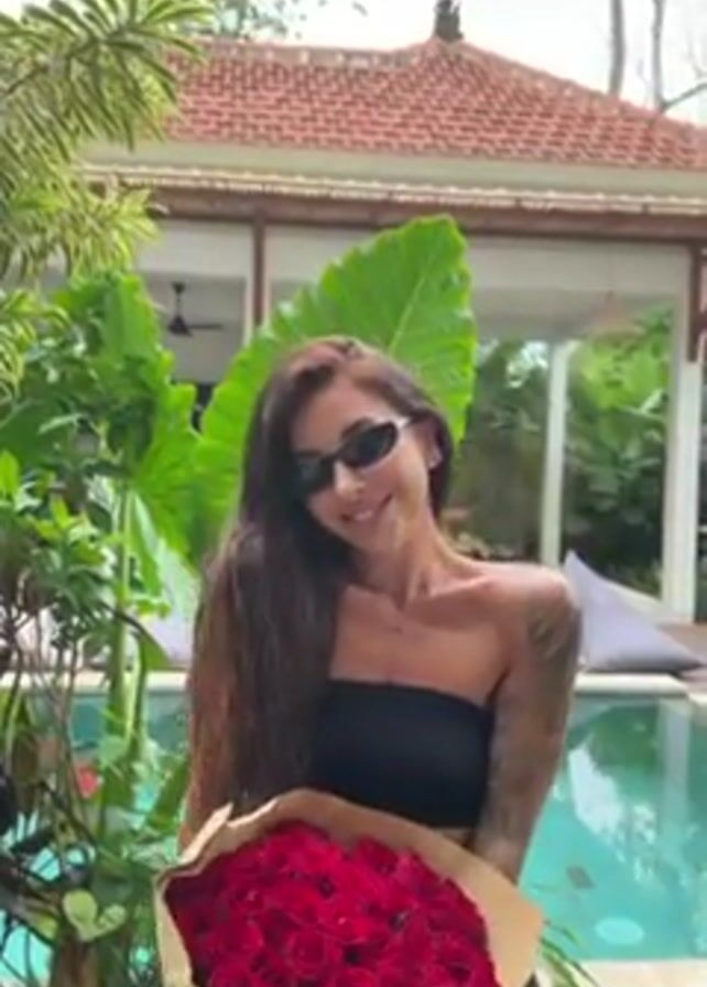 A woman stands outdoors, holding a large bouquet of red roses wrapped in brown paper. She wears a black top, black pants, and sunglasses. She smiles, poses with the flowers, and shakes her head to flip her hair. Behind her is a swimming pool and a Balinese-style building with a red tile roof. Lush green plants surround the scene.