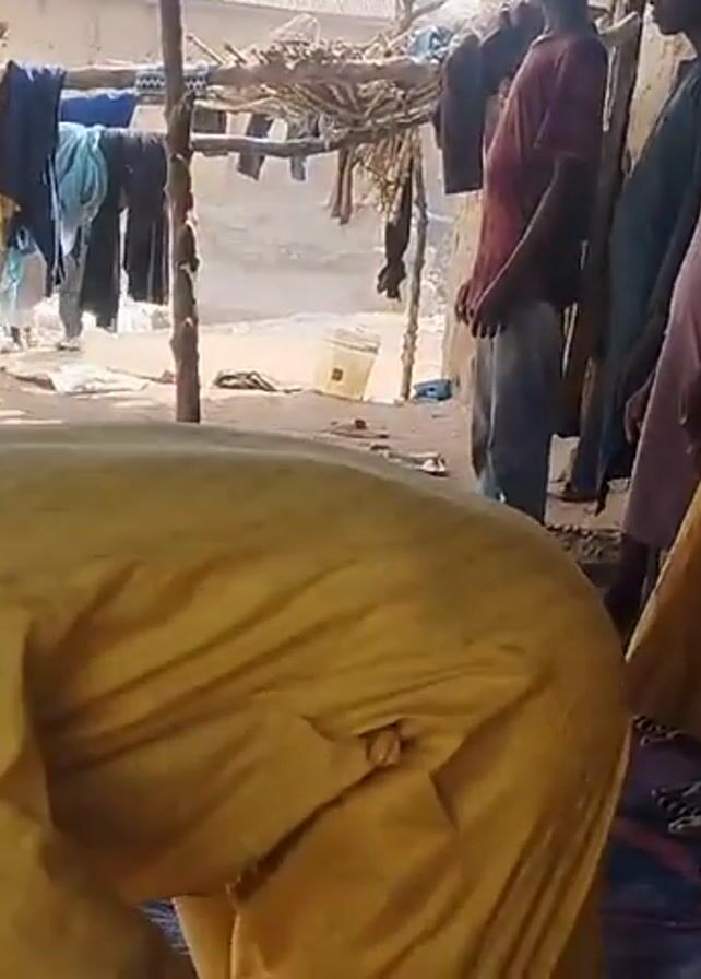 A group of people are praying outside near a building. The person in the foreground is wearing a yellow shirt and is bowed on a prayer rug. A line of people are behind him, also bowed in prayer. They are wearing a variety of clothing, including a blue shirt, a red shirt, and a yellow dress. In the background, there is a clothesline with clothes hanging on it and a dog walks by in the distance. The building is made of mud bricks.