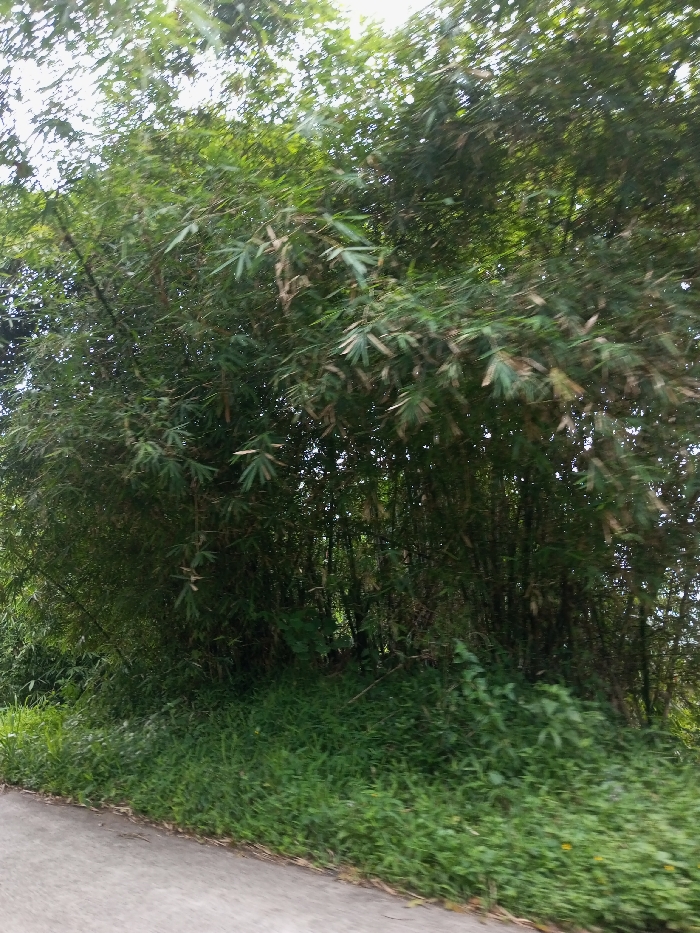 The image displays a dense bamboo grove in Matale, Sri Lanka. A grey paved surface, consistent with a road or path, occupies the lower left foreground, sloping upwards diagonally towards the center. Adjacent to this pavement lies a strip of green ground vegetation, including various grasses and small plants. The midground and background are dominated by a thick stand of bamboo trees, characterized by numerous slender, vertical culms and abundant green leaves, some exhibiting areas of brown discoloration. Diffused sunlight filters through the dense canopy, with sections of a bright sky visible through the upper foliage. No individuals, specific actions, or man-made objects other than the paved surface are present within the scene.