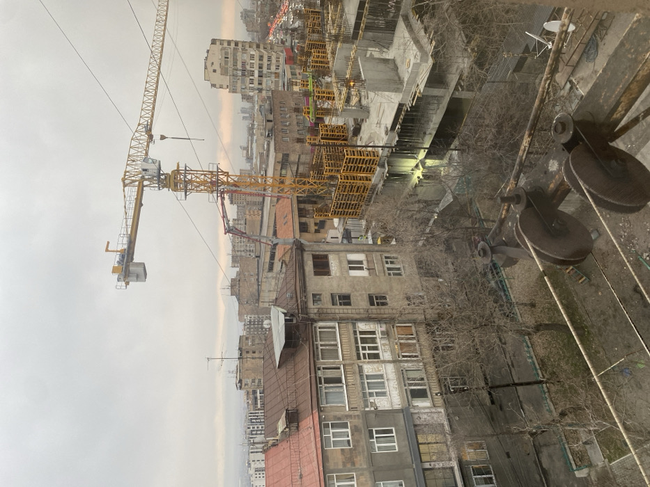 A high-angle urban landscape in Yerevan, Armenia, is depicted under an overcast sky. In the immediate foreground, positioned on a rooftop, are two sets of rusted metal pulleys mounted on a horizontal bar, with white lines extending from them. Below and to the left, a multi-story residential building with a reddish-brown metal roof features various window designs and exhibits signs of wear on its facade. A narrow, treelined street with bare deciduous trees separates this building from the immediate foreground. To the right, a large construction site is active. A prominent yellow tower crane is centrally positioned, with its jib extending horizontally. Below the crane, a red and yellow concrete pump truck with an articulated arm is visible. Multiple levels of a concrete structure are under construction, with rebar protruding and numerous bright yellow formwork panels stacked or in active use across the site. Artificial yellow light emanates from a lower level of the unfinished building. A single individual, likely a construction worker, is faintly visible on the construction site near the concrete pump. The background consists of a dense urban sprawl with a mix of multi-story buildings extending towards a hazy horizon, where distant mountains are visible. A busy street with visible vehicle lights (suggesting traffic) is present in the far right background. The overall lighting is diffused and cool, consistent with an overcast day or approaching dusk.