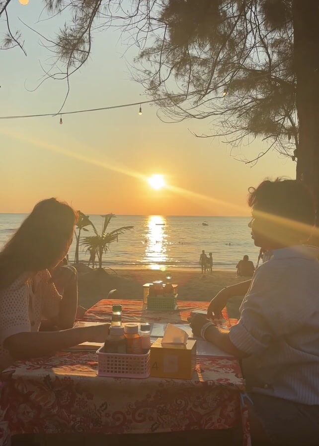 Two individuals are seated at a table, presumably dining, with a clear view of the sunset over the ocean. The table is covered with a patterned tablecloth and has various condiments and napkins arranged in the center. The sun casts a bright glare on the water, creating a shimmering effect. In the background, figures can be seen on the beach. There are trees overhead, and a string of lights is partially visible. The overall setting appears to be a restaurant or dining area located on or near the beach.