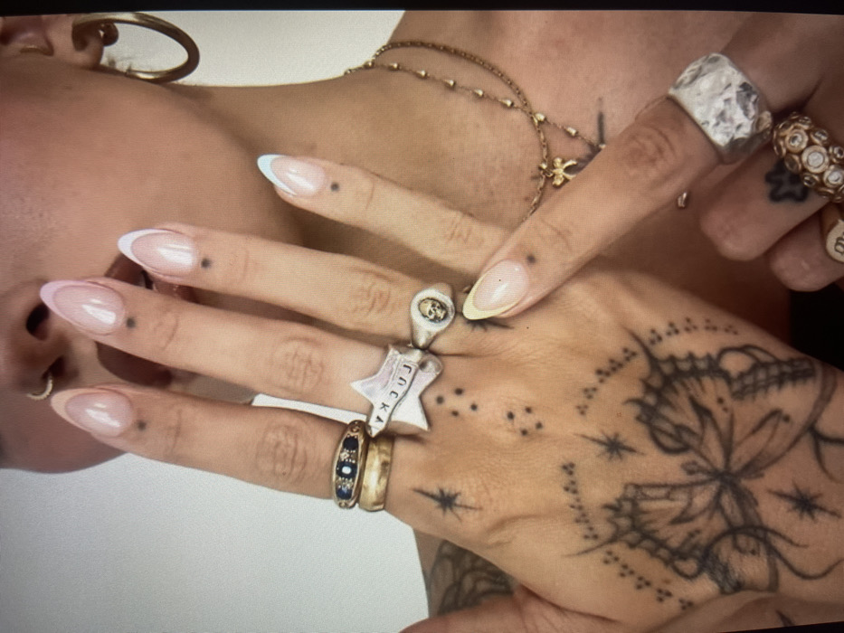 A close-up photograph features an individual from the nose down, with their left hand raised towards their face. The individual has a gold hoop nose ring and a large gold hoop earring visible on the right ear. A gold chain necklace with a small bow-shaped pendant is visible around the neck. The left hand is prominently displayed, adorned with numerous rings and extensive tattoos. The nails are long, almond-shaped, and feature French tips; the index finger and pinky nails have white tips, the middle finger nail has a light blue tip, and the ring finger nail has a pale yellow tip. Each visible nail has a small black dot tattoo near the cuticle. Rings on the left hand include: - Index finger: A wide gold band and a thinner gold band with three dark blue oval stones, each containing a white star-like emblem. - Middle finger: A silver-colored star-shaped ring with "LUCKY" engraved on its face. - Ring finger: A silver-colored ring with a skull motif. - Pinky finger: A large, hammered silver-colored ring and a gold-colored ring with multiple clear circular stones. The back of the left hand is covered with tattoos, most notably a large, detailed butterfly or moth design. Scattered around the butterfly are multiple small star tattoos and patterns of numerous small dots. A portion of a seahorse tattoo is visible on the wrist/lower palm area, and a small flower-like tattoo is on the pinky finger. The individual's fingers are slightly splayed, with the middle and index fingers positioned near the lower lip, partially obscuring it. The background is a plain, light, solid color, suggesting a studio or controlled environment. The precise location in the city of The Hague, Netherlands, cannot be determined from the visual information provided in this image.