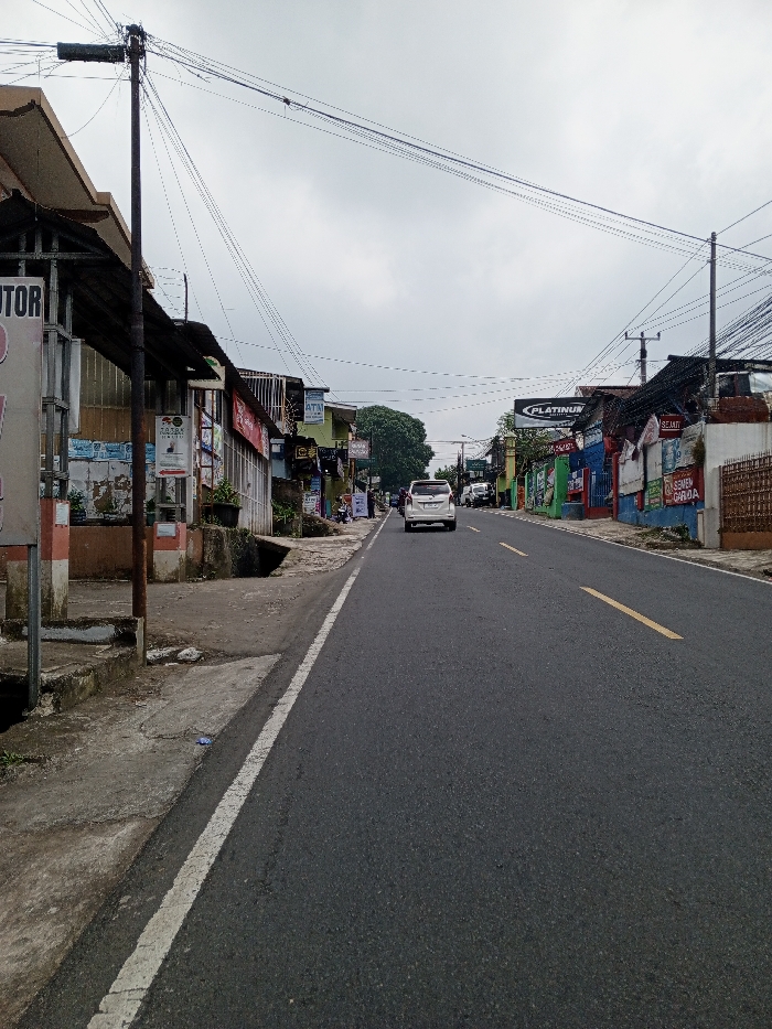 The image displays a street scene under an overcast sky. The asserted location in Multhan, India, is factually incorrect; visible signage, specifically "ATM BCA" (an Indonesian bank) and "Semen GARUDA" (an Indonesian cement brand), alongside the Indonesian/Malay terms "Sejati" and "Motor Rahayu," indicates the scene is located in an Indonesian or Malay-speaking region. The central subject is an asphalt road, featuring a solid white line delineating its right edge and double broken yellow lines down the center, indicating two-way traffic. A white multi-purpose vehicle, consistent with a Toyota Avanza model, is positioned on the road, moving away from the viewer. A second, smaller white vehicle follows at a greater distance. On the left side of the road, a concrete sidewalk, appearing worn and uneven, runs parallel to a series of commercial establishments or residences. A dark utility pole, heavily laden with numerous overhead electrical and communication wires, is prominent in the foreground. Building facades display varied colors and conditions, with signage partially visible, including "MOTOR RAHAYU" and "ATM BCA." Potted plants are positioned near some storefronts. Distant, indistinct human figures are visible on the sidewalk further down the street. The right side of the road also features a line of buildings. Overhead signs read "PLATINUM" and "SEJATI." Another sign for "SEMEN GARUDA" is affixed to a building facade. Utility poles and a network of overhead wires are present on this side. The buildings exhibit various paint colors, including blue, green, and white. Lush green trees are visible in the background, suggesting a tropical or subtropical environment. No specific actions or interactions between individuals are discernible.