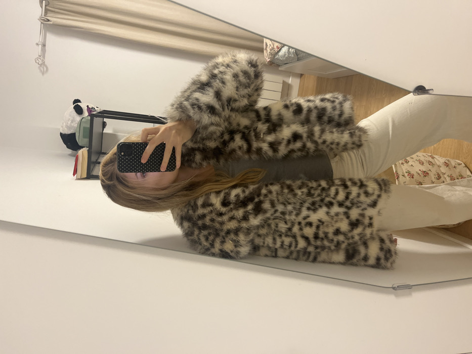 A woman is depicted taking a mirror selfie inside a room located in the city of Madrid, Spain. She has long, light brown hair and wears a faux fur coat with a dark brown and cream leopard print over a grey top and cream-colored wide-leg trousers. A black smartphone with a white polka-dot case, held in her right hand, obscures her face. The reflection reveals a domestic setting with white walls and a light-colored wooden floor. Visible objects include a black metal shelving unit on the right, holding items such as books, a green pencil case, and a black and white plush toy. A cream curtain on a decorative rod, a white radiator, and a section of a bed with a patterned duvet are also present. On the floor to the left, a fabric basket with a red floral pattern is visible.