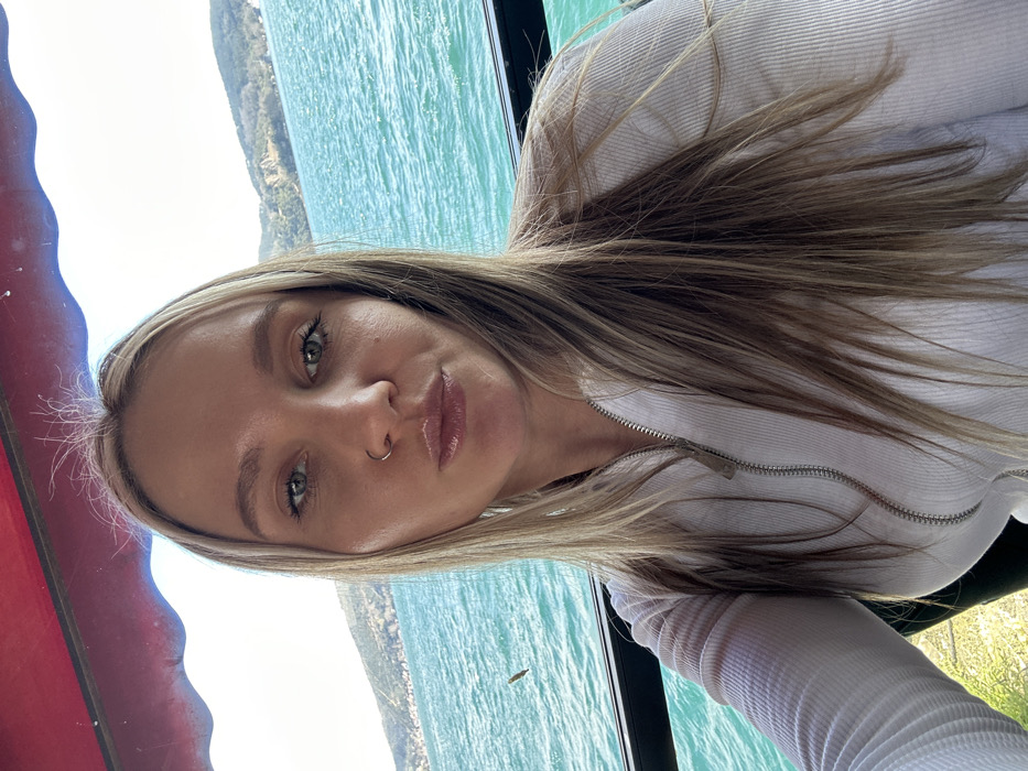 A female subject is depicted in a close-up, selfie-style photograph, taken from an outdoor seating area in Beykoz, Turkey, overlooking the Bosphorus Strait. The subject, positioned centrally, has long, light blonde hair with darker roots, light-colored eyes, and a silver ring piercing in her left nostril. Her lips are puckered. She is wearing a white, ribbed, long-sleeved top with a silver zipper partially open at the front. A dark horizontal frame, likely part of a window or railing, is visible at mid-height behind her. Beyond this barrier, the turquoise waters of the Bosphorus Strait exhibit surface ripples. In the background, a distant, vegetated landmass with visible rock formations and scattered buildings lines the opposite shore under a bright, clear sky. A red awning or canopy partially extends over the upper portion of the frame.