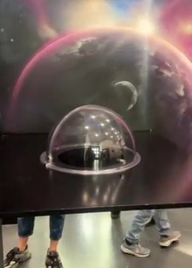 n adult with glasses popping their head up into a clear dome on a table. The dome has Christmas-style lights hanging inside of it. The table is black and there is a colorful planetary background on the wall behind it. There are two other people whose legs are visible. The floor is a glossy gray.
