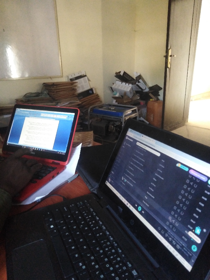 The image depicts an indoor workspace in Ban, Nigeria. A person, whose dark-skinned hands are visible, is actively typing on a red Dell laptop displaying a word processing document. Adjacent to it, a black HP laptop is open, showing a dark-themed interface with a list of items, possibly a media player. Both laptops rest on a wooden desk. In the background, against a light yellow wall, a whiteboard is mounted. Below the whiteboard, numerous stacks of brown folders and printed materials are organized. A blue and black portable generator is situated on the floor in the mid-ground, with a pile of cardboard boxes and an orange plastic container nearby. An open wooden door with a brass handle is visible on the right, revealing a brightly lit area beyond. The room appears functional and somewhat cluttered.