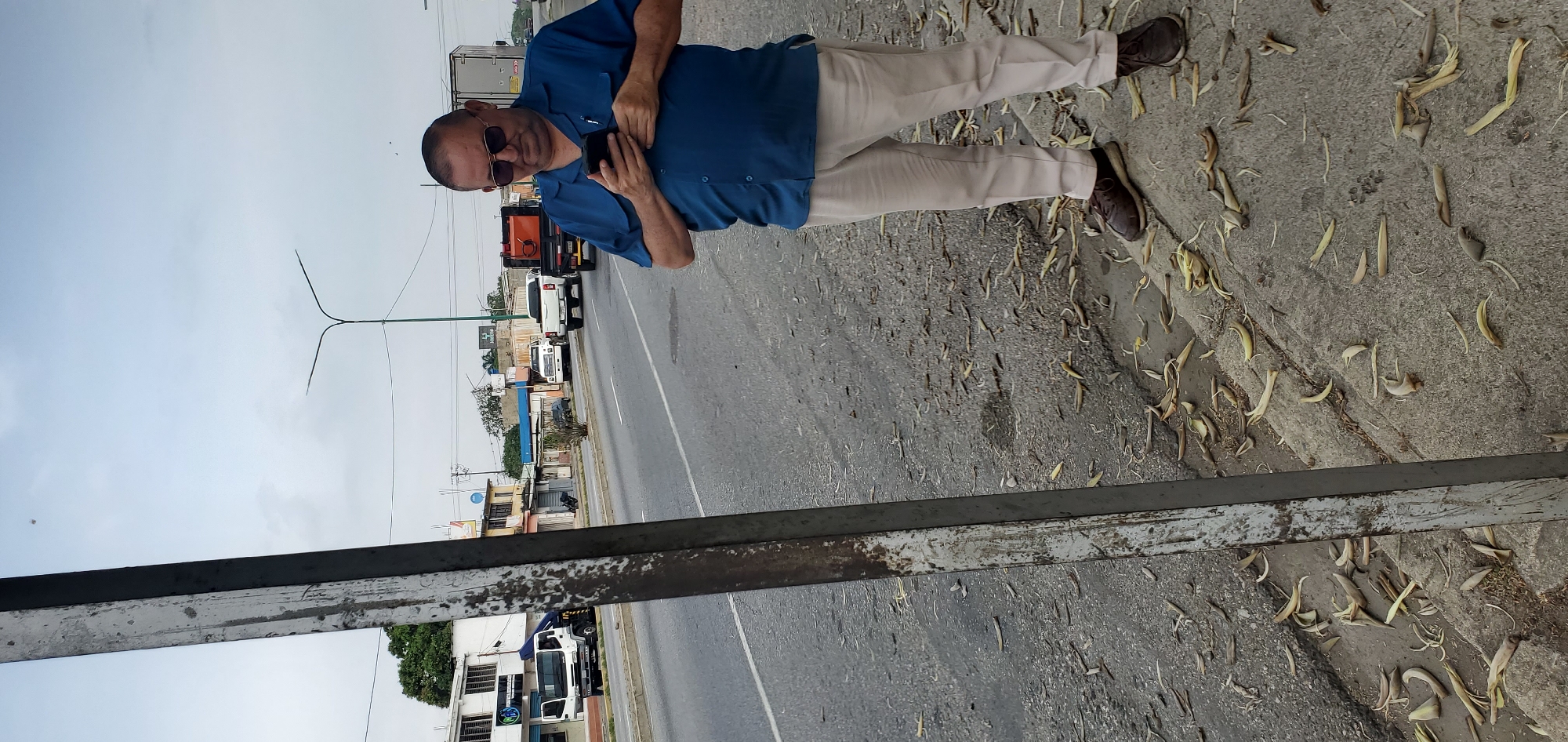 The image depicts a man standing on a sidewalk next to a road. The man is wearing a blue shirt, tan pants, and brown shoes. He is holding a cell phone in his hands. He also has sunglasses on. Behind the man, there is a road with several vehicles on it, including trucks and cars. Across the road, there are buildings and trees. The sky is overcast. The sidewalk is covered in leaves. A rusty metal bar is in the foreground. The location is Cabudare, Venezuela.