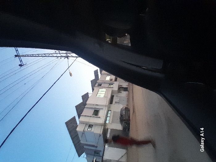 An angled view from inside a vehicle reveals a street scene. A multi-story building with protruding awnings and several windows is visible. A parked car sits in front. A person in red clothing is near the building. Overhead, power lines stretch across a blue sky supported by a utility pole. The vehicle's interior elements, including the dashboard and roof, frame the view. "Galaxy A14" is visible in the lower right corner.