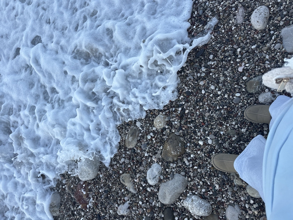 The image depicts a top-down view of a pebble beach in Šušanj, Montenegro. A person is observed standing at the edge of the water, with their lower legs and feet visible in the bottom third of the frame. The person is wearing light blue trousers and a pair of tan/beige closed-toe slippers. A small, light-colored, possibly fuzzy object with a visible gold zipper is situated to the right of the person's right foot. The beach is composed of numerous dark grey, light grey, white, and reddish-brown pebbles and small stones of varying sizes. In the upper portion of the image, white, frothy sea foam is actively washing over the pebbles and larger, rounded stones, indicating the presence of breaking waves.