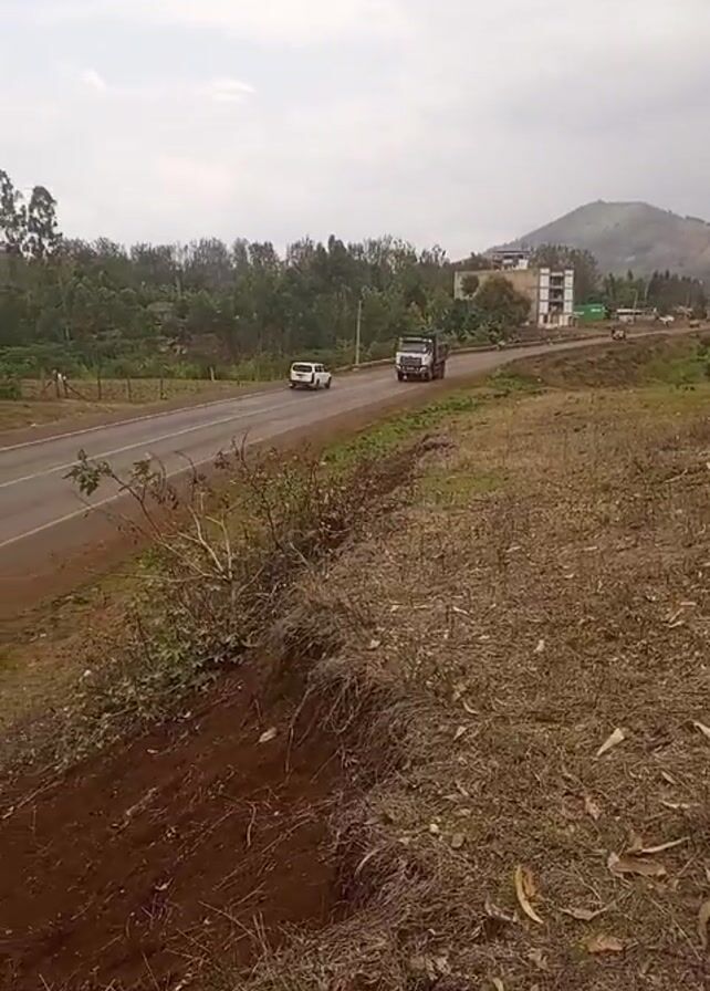 white and dark gray dump truck moving on a road in a rural area. There's another vehicle driving in the opposite direction and a building visible in the background, as well as trees and rolling hills. The camera is static, and the focus is on the truck as it passes by. The area around the road is covered in dry vegetation.