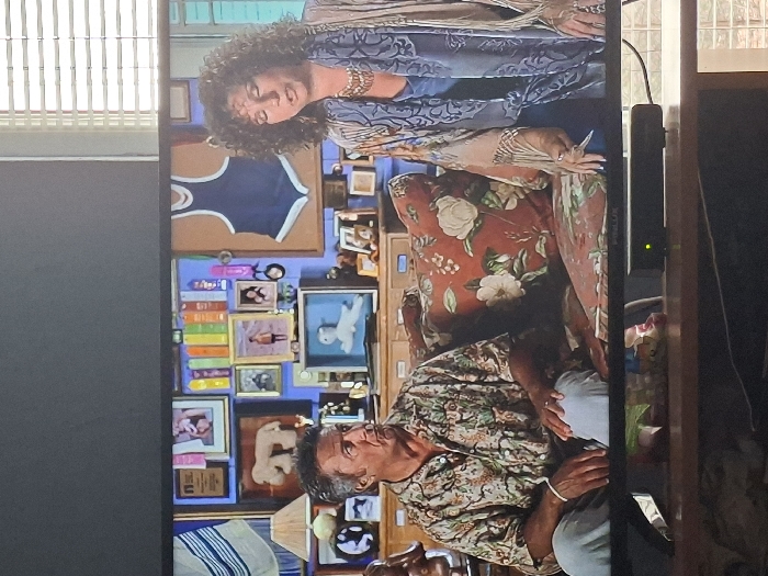 The image displays a photograph of a flat-screen television showing a scene with two individuals. The photograph itself was taken indoors, presumably in Selyanin, Bulgaria, as per the prompt's instruction, though no specific features of the city are visible in the image itself. **Foreground (around the TV):** The television is situated on a wooden surface. Below the screen, a black electronic device with a single illuminated green indicator light is centered. To the left of this device, a colorful plastic bag or package is visible. On the right side of the frame, a portion of a window with closed horizontal blinds allows ambient light into the room. The television's bezel is black, with the brand name "FINLUX" visible at the bottom center. **Content on Television Screen:** The screen depicts two individuals seated on a couch against a brightly decorated blue wall. * **Male Subject (Left):** A male individual with short, dark, curly hair is seated, facing slightly right, with his mouth open in an expressive manner. He wears a short-sleeved, collared shirt with a light background and a pattern of green and brown foliage/flowers, along with light blue trousers. A white band is present on his left wrist. * **Female Subject (Right):** A female individual with voluminous dark, curly hair is seated to the right of the male, facing slightly left, also with her mouth open in an expressive posture. She wears a light blue top beneath a flowing, light-colored garment, possibly a shawl or jacket, featuring a pattern and fringed edges. A prominent gold-colored necklace adorns her neck. * **Furniture:** The individuals are seated on a couch with cushions featuring a reddish-brown background patterned with large white flowers and green leaves. * **Background (on screen):** The blue wall behind the subjects is densely adorned with various decorative items. These include multiple framed pictures, photographs, and possibly certificates (one with an "NCE" ribbon visible). A large, light brown, poodle-like plush figure is displayed in a frame on the left. A smaller white quadruped figure is encased in a blue-framed shadow box below the center. A dark blue athletic singlet or swimsuit is mounted on a light board to the right. Numerous other small objects, colorful books, and pieces of memorabilia are arranged throughout the background. A table lamp with a light-colored shade is partially visible on the far left. **Actions/Interactions:** Both individuals on the screen appear to be actively speaking or vocalizing, indicated by their open mouths and engaged facial expressions, suggesting a dialogue or performance within the depicted scene.