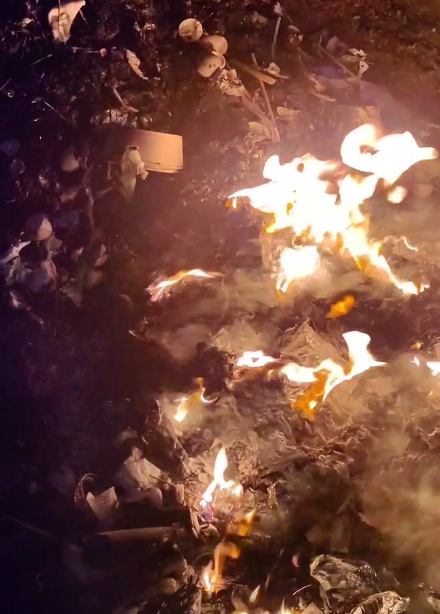 fire burning in a pile of trash. The flames are bright and the smoke is thick. There are various objects among the trash. The scene is dark.