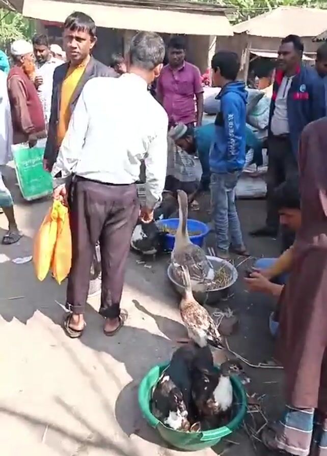 busy outdoor market scene with several people gathered around tubs and crates of live birds. The birds include ducks and geese. Several people are inspecting the birds, and one person is using a cell phone to take a photo or video of the birds. The people are dressed in a variety of casual clothing. The market appears to be in a village or rural area, with simple buildings in the background. The ground is paved with concrete and shows signs of wear. There is straw or hay scattered around some of the tubs.
