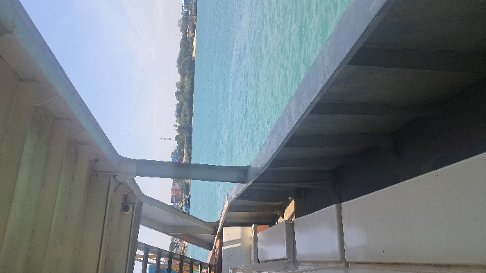 - "The image depicts a static scene captured from the interior, covered deck of a large vessel or structure, likely a ferry, positioned on turquoise-blue water under a clear sky" by FM-fXIKl2, licensed under CC BY 4.0