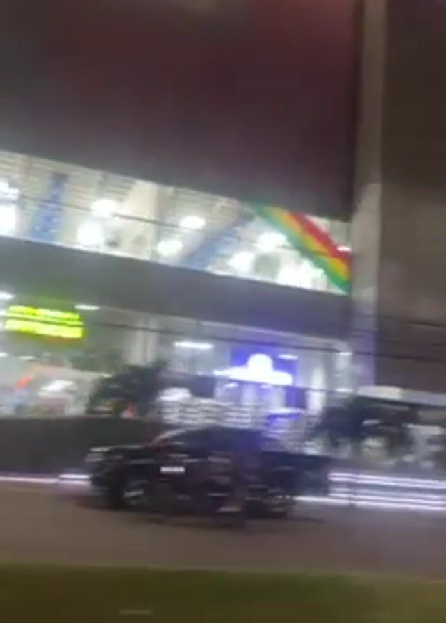 nighttime scene of a building complex called "Avenida Brasil Megacentro Comercial". The camera appears to be moving, likely from a vehicle passing by. The building is brightly lit with colorful lights and neon signs. There are cars parked in front and people can be seen standing near the entrance. There is a multi-colored decorative design above the main entrance signage.